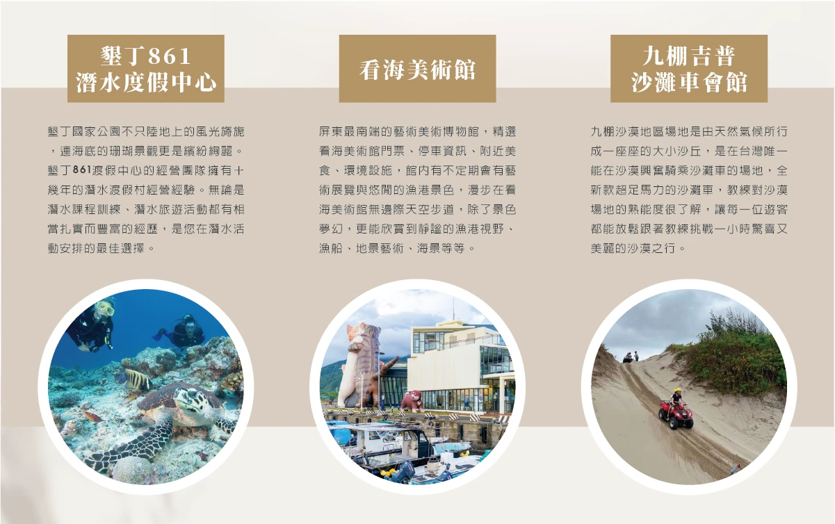 民宿出發🚌(巴士/15分)墾丁海中天餐廳🚌 (巴士/45分)九棚吉普沙灘車會館🚌看海美術館☆(巴士/60分) 🚌高雄85公里(90min)