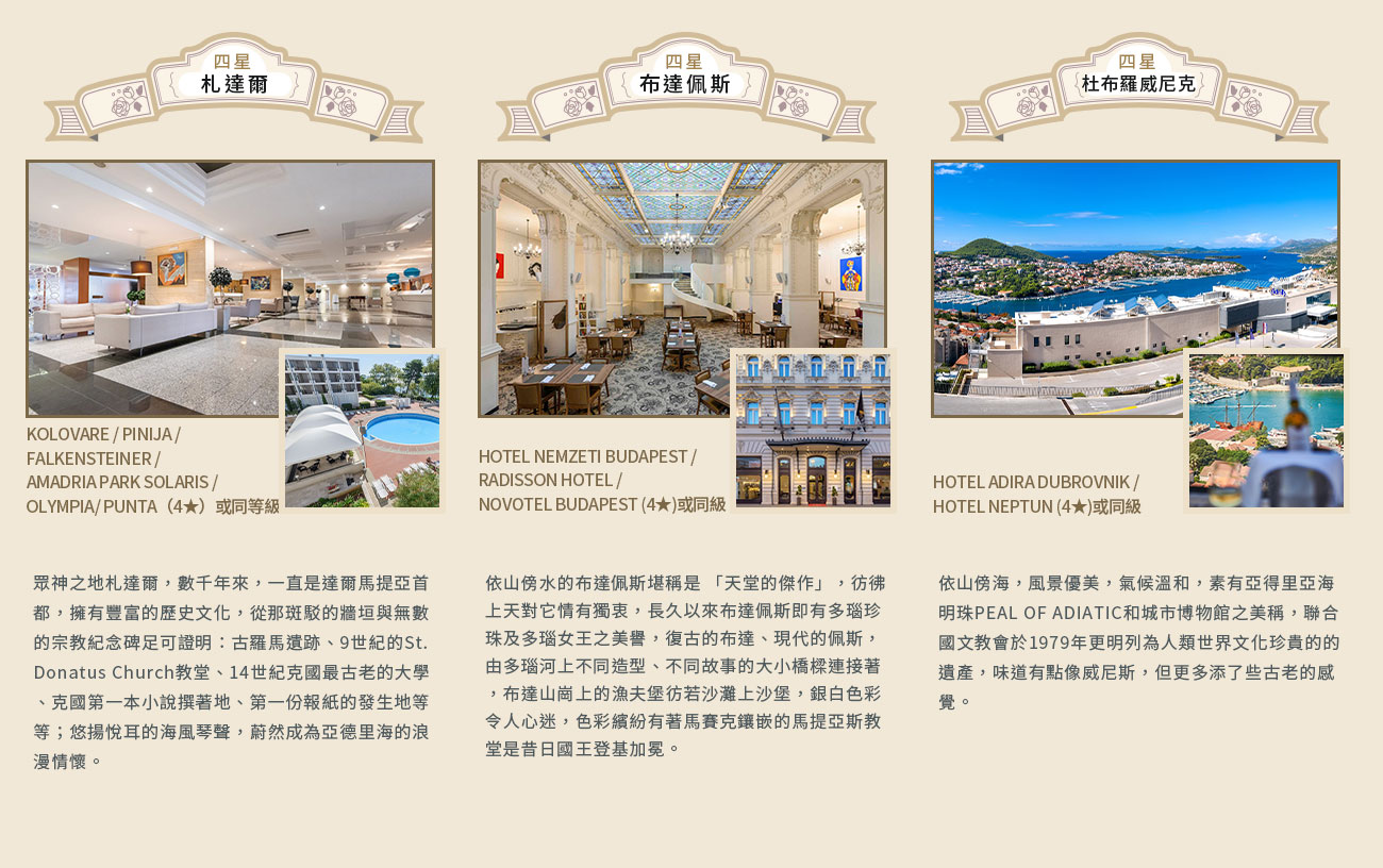 住宿:HOTEL ADRIA 或 HOTEL NEPTUN 或 HOTEL LERO 或 HOTEL CITY 或 HOTEL GRAND (4★)或同級