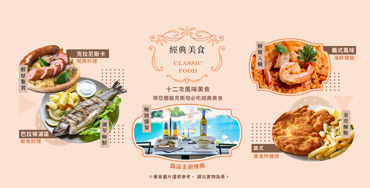早餐:飯店內早餐 午餐:巴拉頓湖區鮮魚料理 晚餐:中華料理七菜一湯