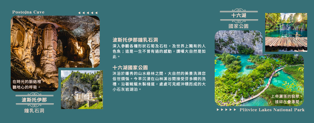 住宿:JEZERO 或 HOTEL PLITVICE 或 DEGENIJA 或 LYRA(3★)或同等級 (十六湖國家公園係因高知名觀光勝地,若遇園區內飯店客滿,則改住園區外敬請見諒)