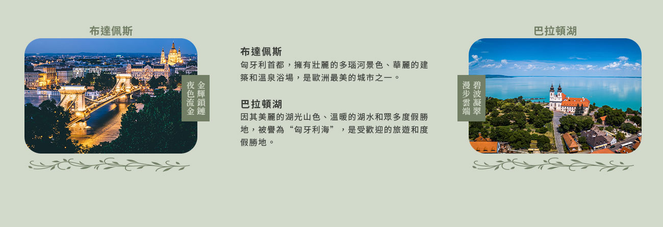布達佩斯段為多瑙河兩岸景致最優美區段,古堡、皇宮、古橋..在此您可一覽多瑙河兩岸明媚風光,晴日時風和日麗,雨天時柔和動人,在寧靜的多瑙河上鍊橋與西西橋上閃閃燈光照耀,今日是何其美麗!