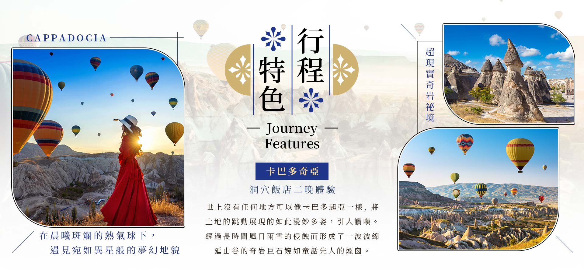 該區因火山融岩地形經長期之風化侵蝕,形成各種奇岩怪石,我們可看到隨著陽光之變換,色澤從白色而粉紅而暗紫的波浪狀岩山;更可看到在大自然的傑作下,聳立天際的各式奇岩怪石而被當地人稱為『精靈的煙囪』,表面平滑的白色岩石群,如波浪一般廣大地散佈在山谷中,真是一遍絕世美景;爾後前往尖端城塞是因為一枚大岩石聳立在城塞的忠心,從這裡晀望葛萊梅奇觀。 這塊岩石的表面有許多開口被稱作”鴿子之家”。爾後我們會帶您參觀幾個具代表性的奇岩造景區:如精靈煙囪Fairy Chimneys (Peri bacalari) near Ürgüp 別名「三姐妹」。天氣晴朗時可看到3916公尺高的Erciyes火山;駱駝岩Camel Rock in Devrent Valley 以狀似駱駝的岩石而得名;帕夏貝Paşabağ 這裡有著最多最高最可愛的精靈煙囪群,別名「磨菇岩」,其間還可看到曾是隱修士生活及祈禱的岩窟居所,現在卻見另一精靈煙囪之內竟是警察守衛的哨所!晚間特別安排於堪稱本區特色的洞穴秀場中欣賞肚皮舞"Turkish night in Cappadocia"等傳統民俗表演。
