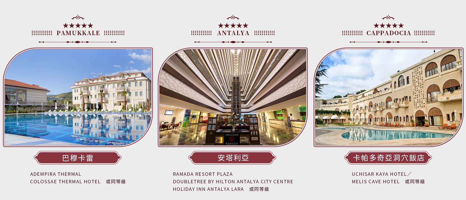 住宿:RAMADA RESORT PLAZA或DOUBLETREE BY HILTON ANTALYA CITY CENTRE或HOLIDAY INN ANTALYA LARA (5★)或同等級