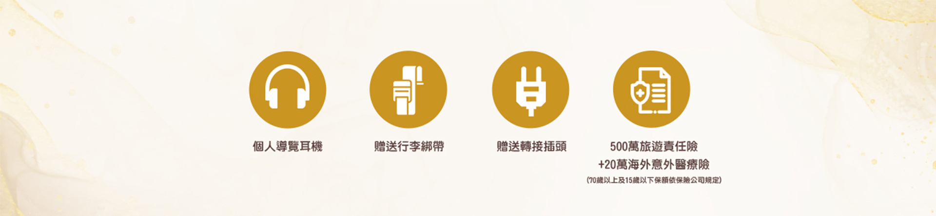 • 本行程包含500萬旅行業責任保險+20萬海外意外醫療保額及旅行社履約保證保險。【旅客未滿15歲或70歲以上,依保險公司規定最高旅責250萬元+20萬海外意外醫療保額】。