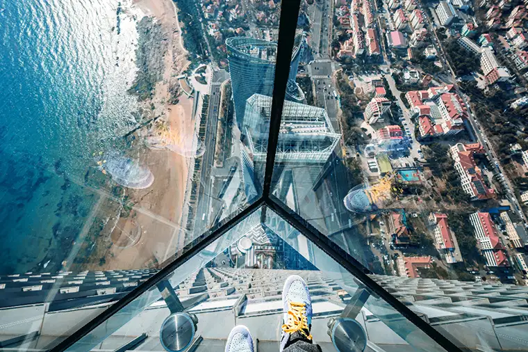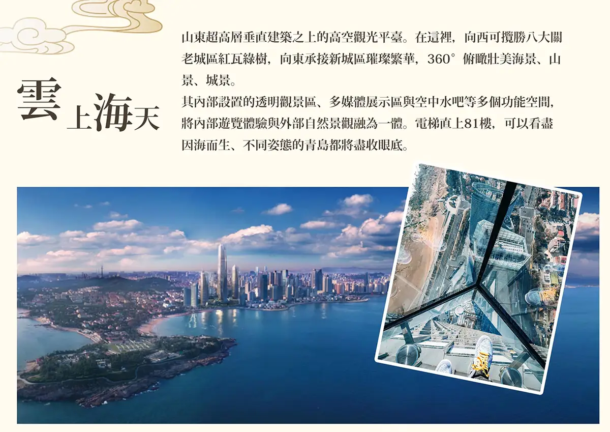 【雲上海天】雲上海天是山東超高層垂直建築之上的高空觀光平臺。在這裡,向西可攬勝八大關老城區紅瓦綠樹,向東承接新城區璀璨繁華,360°俯瞰壯美海景、山景、城景,全方位感受身處"天空之城"的獨特體驗。其內部設置的透明觀景區、沉浸式體驗區、多媒體展示區與空中水吧等多個功能空間,將內部遊覽體驗與外部自然景觀融為一體。電梯直上81樓,站在369米之上的城市觀光廳,可以看盡因海而生、向海而興的魅力青島在時間長河中的風貌變遷與發展動線。隨著觀光者的漫步,不同姿態的青島都將盡收眼底。