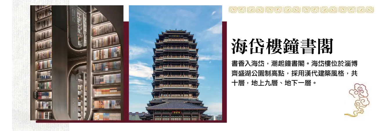 【鐘書閣】書香入海岱,潮起鐘書閣。位於淄博的鐘書閣,被譽為最美網紅打卡書店,以鏡面設計與環形書架打造出夢幻空間。走進其中,如置身書海迷宮,萬卷藏書在燈光映照下宛如波浪翻湧。這裡不僅是一處書店,更是結合藝術美學與閱讀靜謐的文化地標,吸引無數旅人與文青朝聖打卡。