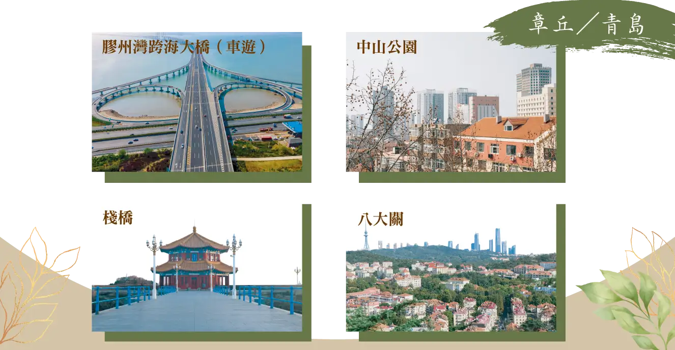 【青島】於山東半島南端黃海之濱,因島上山岩聳秀,林木蓊鬱而得名。於1898年將膠澳、青島一帶租借給德國,使得現今當地仍保有徳式風格建築,也奠定該市的城市格局,而這座中西合璧的海濱城市,又因啤酒形象深植人心而享譽國際,被譽為「世界啤酒之城」。