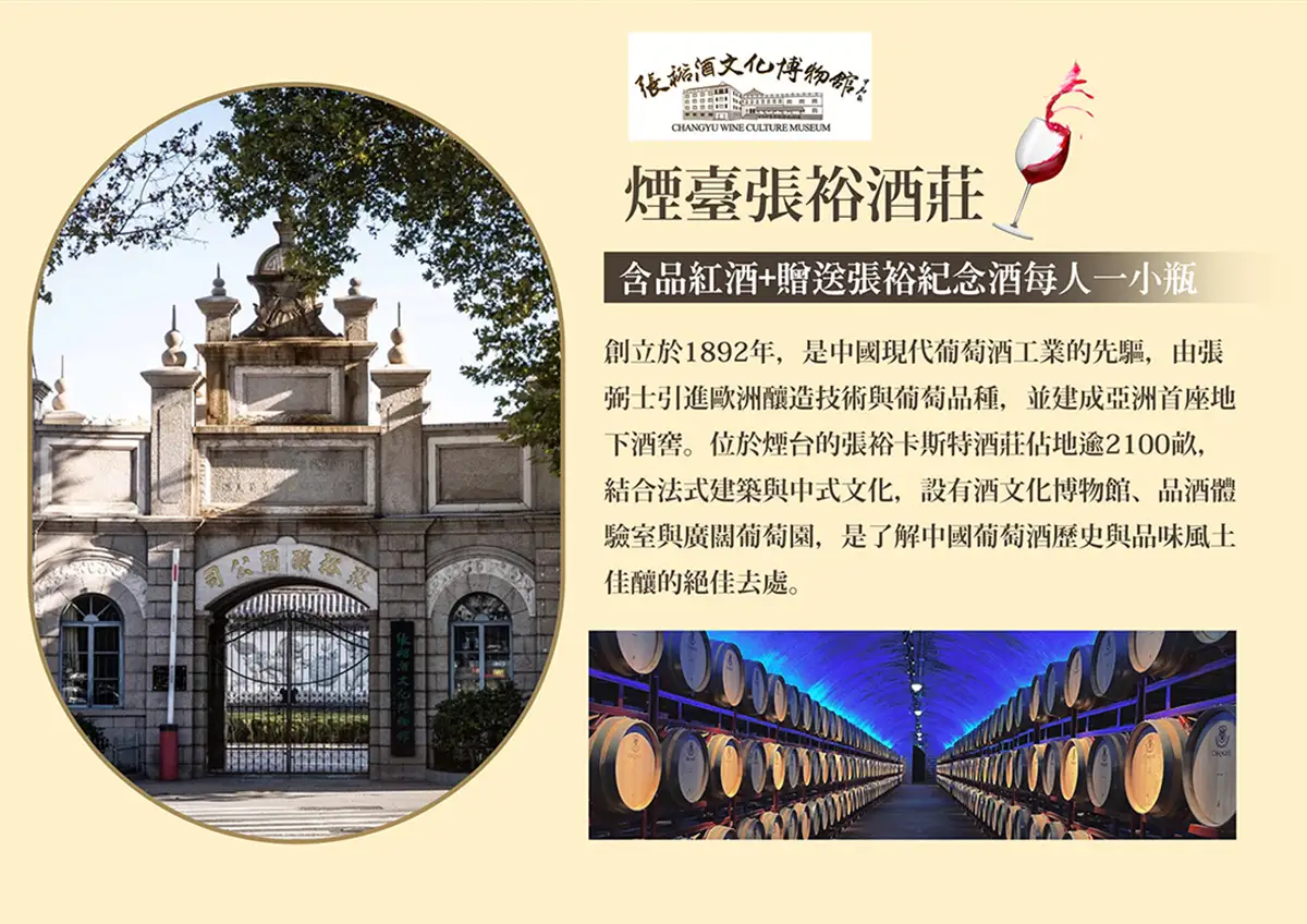【張裕酒莊】創立於1892年,是中國現代葡萄酒工業的先驅,由張弼士引進歐洲釀造技術與葡萄品種,並建成亞洲首座地下酒窖。位於煙台的張裕卡斯特酒莊佔地逾2100畝,結合法式建築與中式文化,設有酒文化博物館、品酒體驗室與廣闊葡萄園,是了解中國葡萄酒歷史與品味風土佳釀的絕佳去處。
