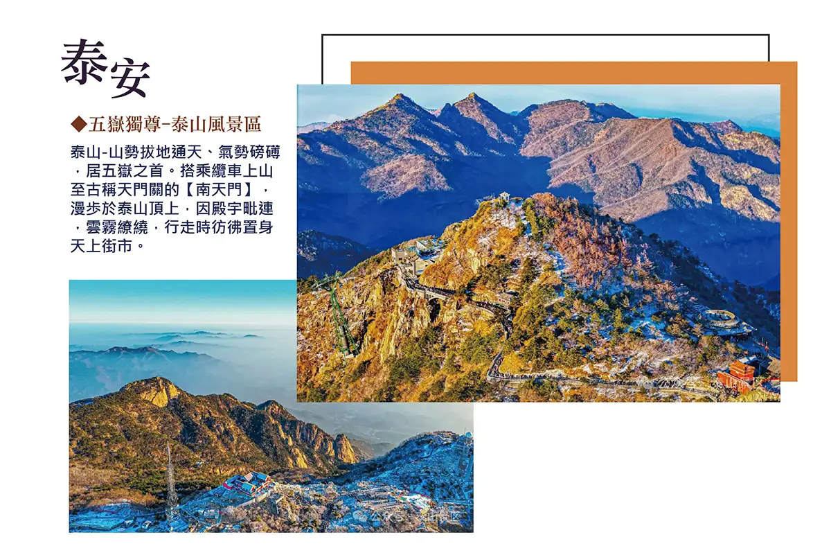 【泰山景區】泰山~山勢拔地通天、氣勢磅礡,居五嶽之首。搭乘纜車上山至古稱天門關的【南天門】,漫歩於泰山頂上,因殿宇毗連,雲霧繚繞,行走時彷彿置身天上街市。