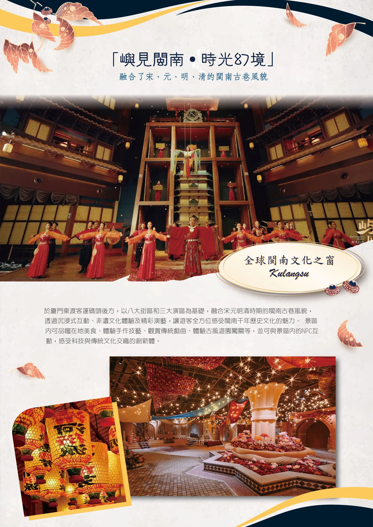 【嶼見閩南時光幻境】於廈門東渡客運碼頭後方,以八大街區和三大演區為基礎,融合宋元明清時期的閩南古巷風貌,透過沉浸式互動、非遺文化體驗及精彩演藝,讓遊客全方位感受閩南千年歷史文化的魅力。 景區內可品嚐在地美食、體驗手作技藝、觀賞傳統戲曲、體驗古風遊園闖關等,並可與景區內的NPC互動,感受科技與傳統文化交織的創新體。