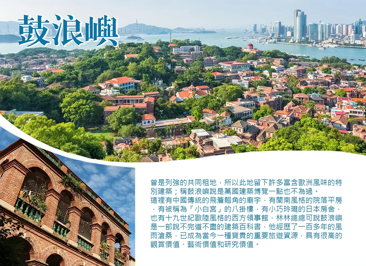 【鼓浪嶼景區】島上崗巒疊起,盛林茂密、古木參天、風景如畫,因為曾是列強的共同租地,所以此地留下許多富含歐洲風味的特別建築;稱鼓浪嶼說是萬國建築博覽一點也不為過,在彈丸之地的小島上薈萃了上千座風格各異、中西合壁的中外建築。這裡有中國傳統的飛簷翹角的廟宇,有閩南風格的院落平房,有被稱為「小白宮」的八掛樓,有小巧玲瓏的日本房舍,也有十九世紀歐陸風格的西方領事館,林林總總可說鼓浪嶼是一部說不完道不盡的建築百科書,他經歷了一百多年的風雨滄桑,已成為當今一種寶貴的重要旅遊資源,具有很高的觀賞價值、藝術價值和研究價值。