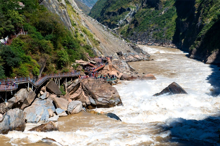 續行約25公里(約1小時)前往【虎跳峽景區☆】(含上下扶梯,停留約1小時)。這是世界上最深的峽谷之一,金沙江水急流直下,兩岸高山峭壁對峙,傳說老虎曾一躍而過,因此得名「虎跳峽」。