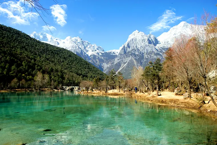 下山後前往【藍月谷☆】(約4公里,車程約15分鐘,含電瓶車,停留約1小時),這裡湖水碧藍如玉,山影倒映其中,被譽為「地球上最接近天堂的地方」,隨手一拍皆如畫。