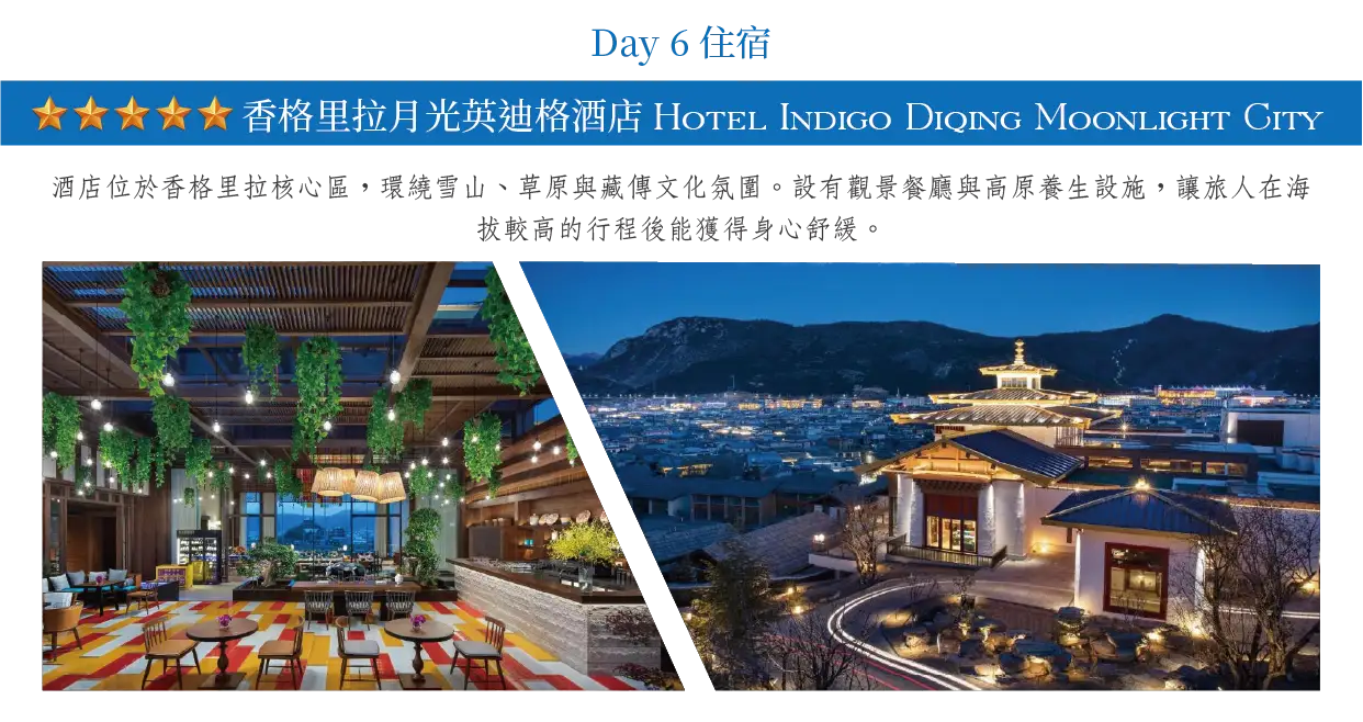 晚餐於香格里拉市區享用(約5公里,車程15分鐘,停留約1小時),餐後前往酒店(約3公里,車程約10分鐘)辦理入住,夜宿香格里拉。