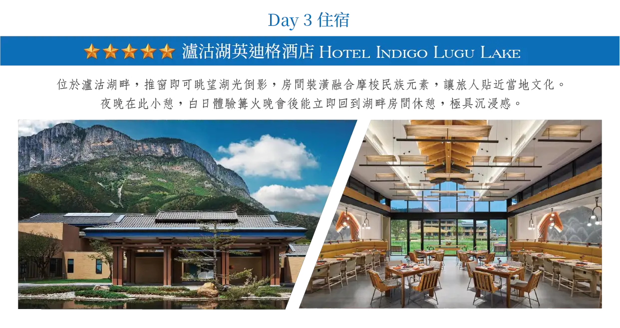 晚間特別安排前往【摩梭傳統篝火晚會☆】(約10.4公里,車程約19分鐘),與當地摩梭族人圍火起舞,體驗原鄉熱情與民族文化。活動結束後返回酒店休息(約10.4公里,車程約19分鐘)。