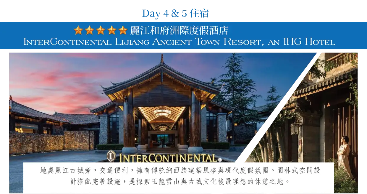 之後驅車返回麗江(約197公里,行車約4小時),抵達後安排下榻酒店並享用晚餐(停留約1.5小時)。