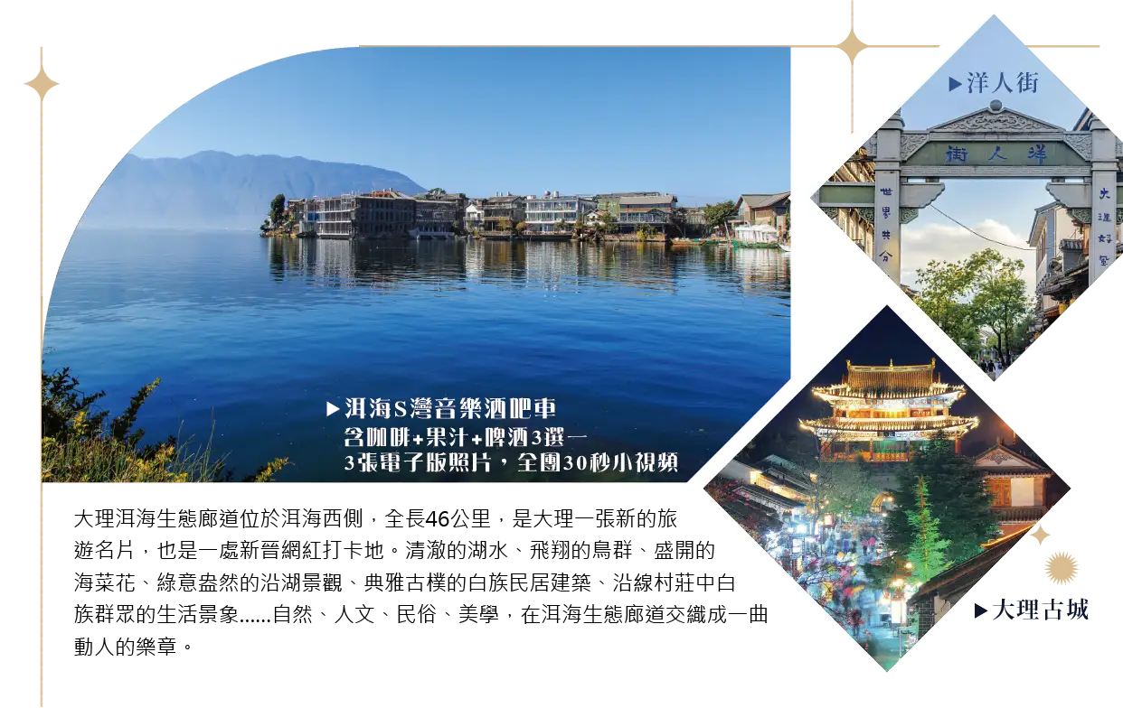 網紅S灣洱海生態走廊音樂酒吧車(果汁+啤酒2選一,3張電子版照片及每團30秒小視頻、大理古城、洋人街散策