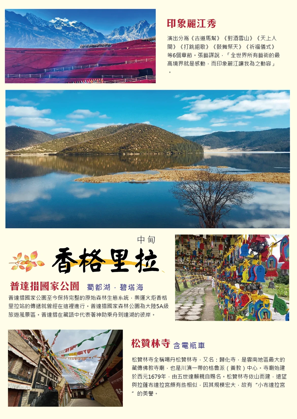 【玉龍雪山】玉龍雪山,位於麗江北方,是中國最南端的終年積雪山脈,也被納西族人視為神山。全山由13座雪峰連綿組成,宛如一條銀白玉龍橫臥天際,因此得名「玉龍」。主峰扇子陡海拔高達5,596公尺,氣勢雄偉。這裡是自然奇觀與民族傳說交織的聖地,一山藏四季,十里不同天。從高山冰川、原始森林、草甸、峽谷,到藏身山腰的白水河與藍月谷,每一站都是明信片般的景色。
