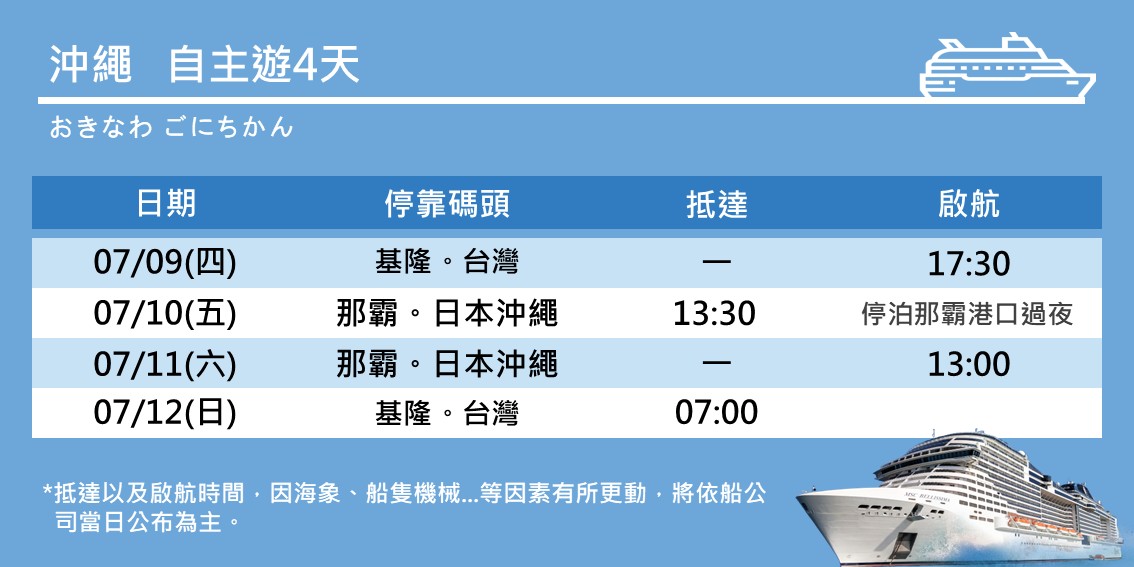 6.本行程各航點,包含起訖點基隆港的抵達、靠泊及離港等時間,須依據天候海象或港口管制等狀況,有隨時異動之可能,各時間點須依MSC地中海郵輪公告或日報為準。
