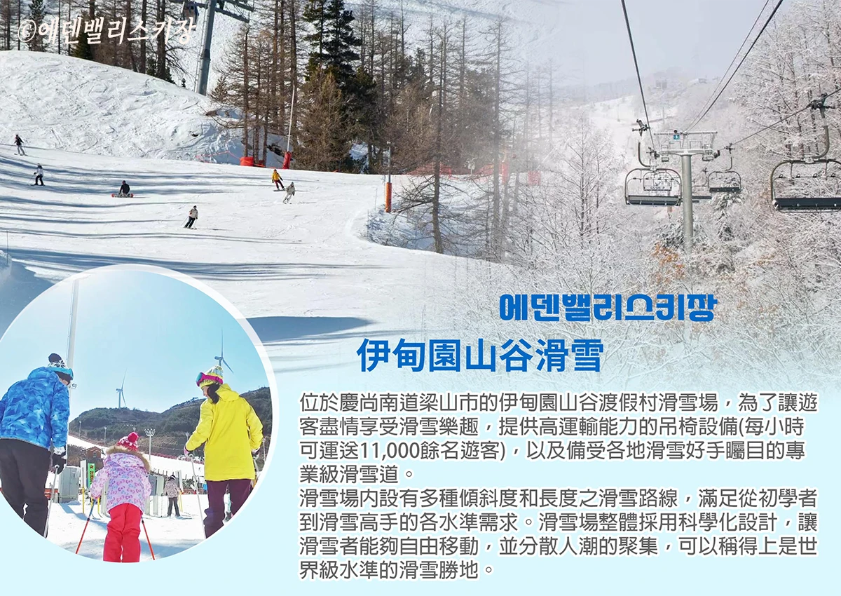 【伊甸園山谷滑雪】位於慶尚南道梁山市的伊甸園山谷渡假村滑雪場,為了讓遊客盡情享受滑雪樂趣,提供高運輸能力的吊椅設備(每小時可運送11,000餘名遊客),以及備受各地滑雪好手矚目的專業級滑雪道。滑雪場內設有多種傾斜度和長度之滑雪路線,滿足從初學者到滑雪高手的各水準需求。滑雪場整體採用科學化設計,讓滑雪者能夠自由移動,並分散人潮的聚集,可以稱得上是世界級水準的滑雪勝地。