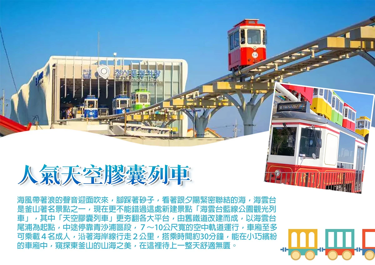 【人氣天空膠囊列車】海風帶著浪的聲音迎面吹來,腳踩著砂子,看著跟夕陽緊密聯結的海,海雲台是釜山著名景點之一,現在更不能錯過這處新建景點「海雲台藍線公園觀光列車」,其中「天空膠囊列車」更夯翻各大平台,由舊鐵道改建而成,以海雲台尾浦為起點,中途停靠青沙浦區段,7~10公尺寬的空中軌道運行,車廂至多可乘載4名成人,沿著海岸線行走2公里,搭乘時間約30分鐘,能在小巧繽紛的車廂中,窺探東釜山的山海之美,在這裡待上一整天舒適無匱。