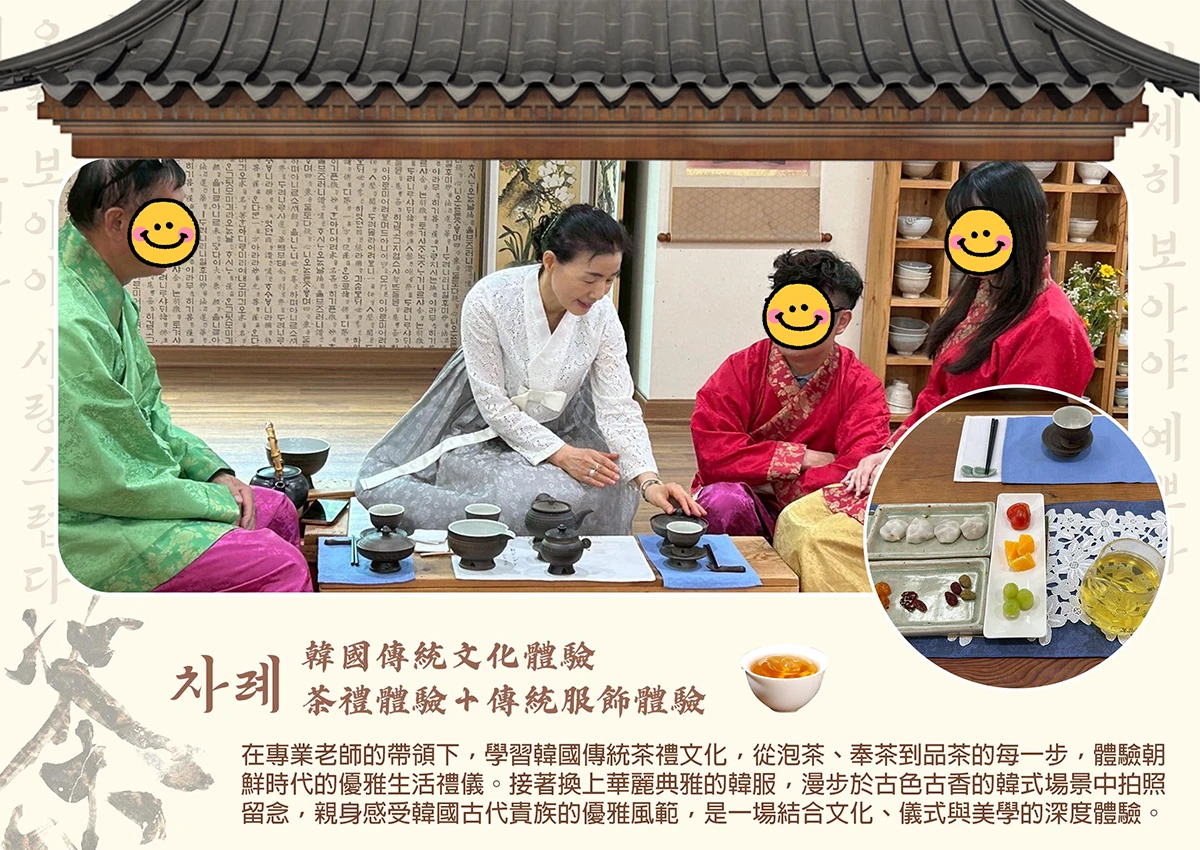 【韓國傳統文化體驗~茶禮體驗+傳統服飾體驗】在專業老師的帶領下,學習韓國傳統茶禮文化,從泡茶、奉茶到品茶的每一步,體驗朝鮮時代的優雅生活禮儀。接著換上華麗典雅的韓服,漫步於古色古香的韓式場景中拍照留念,親身感受韓國古代貴族的優雅風範,是一場結合文化、儀式與美學的深度體驗。