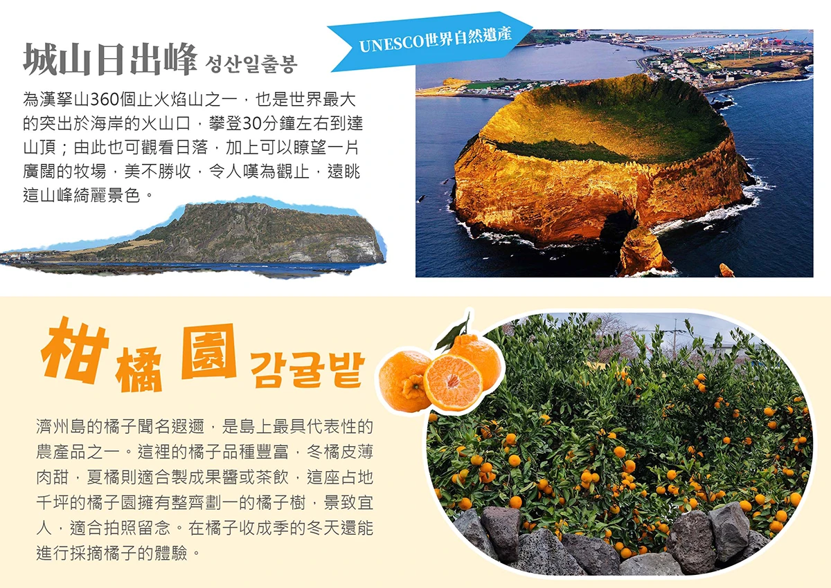 【濟州】位於韓國南端海域,是一座由火山活動形成的島嶼,以溫和氣候與絕美自然景觀聞名。濟州島不僅擁有聯合國認定的世界自然遺產「漢拏山」與「城山日出峰」,島上遍布的黑石牆、橘子園與濟州石爺更展現濃厚的在地文化。曾為朝鮮王朝的流放之地,如今則成為韓國最受歡迎的度假勝地,被譽為「韓國的夏威夷」。