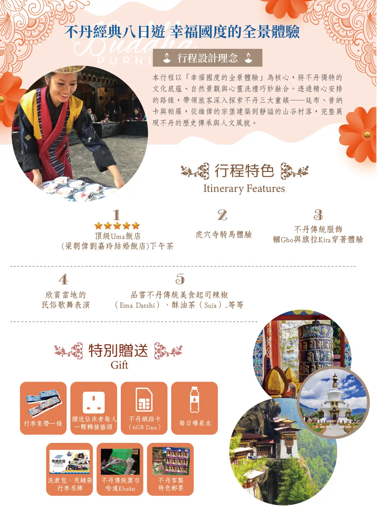 6.由於不丹的特殊地理位置,原先的飛行航班可能因氣候而取消,若遇到這種情況,請配合旅行社的處理方式與建議,定以當下最佳方式解決。