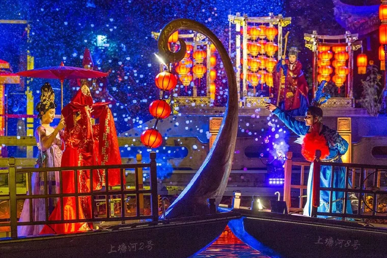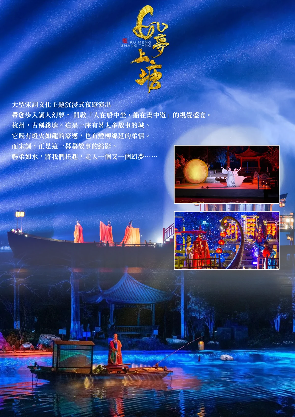 【如夢上塘】抵達杭州後,我們要去體驗目前杭州最火的夜遊項目——《如夢上塘》。這不是傳統的坐在劇場裡看戲,而是「人在船中坐,船在畫中游」。隨著遊船緩緩駛入上塘河,兩岸會利用全息投影、噴泉、燈光和真人表演,將秦、隋、唐、宋等不同時期的歷史故事一一還原。您會看到詩仙李白舉杯邀月,看到蘇東坡泛舟吟唱。整條河道就是一座流動的博物館,光影與水霧交織,真的一如其名,如夢似幻。