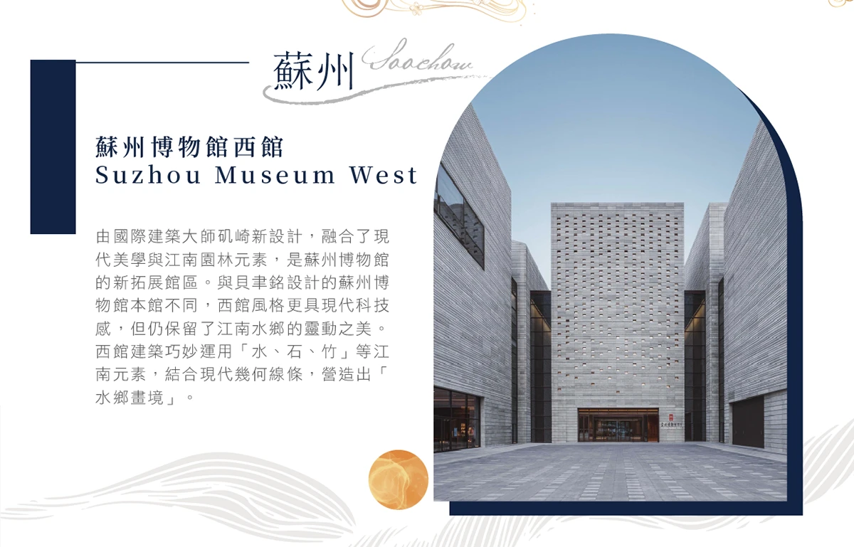 【蘇州博物館(西舘)】蘇博西館由德國著名建築事務所設計,最大的亮點在於那10個邊長約25米的立方體建築。這種「立方體」的設計靈感,源自蘇州傳統民居的「並蒂蓮」與「水陸並行」的格局。西館的體量是本館的四倍,有蘇州通史陳列、國際合作館(大英博物館專廳)、蘇作工藝館~蘇繡、核雕、玉雕、蘇扇……