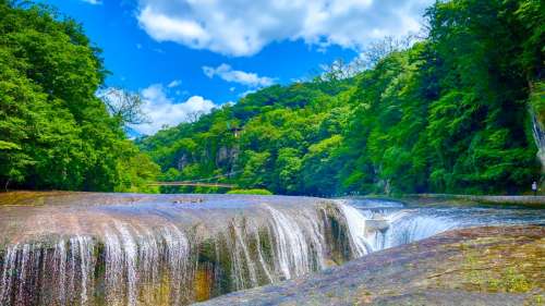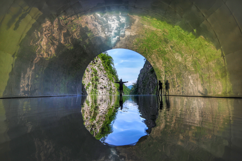 清津峽位於新潟縣,是日本三大峽谷之一,以壯麗的V字型峽谷和清澈溪流聞名,四季皆有不同美景,尤其秋季紅葉映照在峽谷岩壁與水面時最為絢麗,並設有觀景隧道可近距離欣賞雄偉景色。