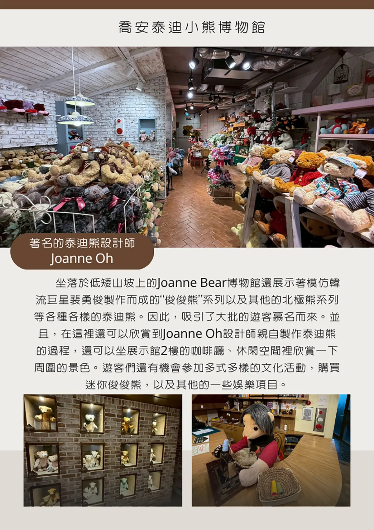 【泰迪小熊博物館】Joanne Bear博物館是世界上著名的泰迪熊設計師Joanne Oh的工作室展示空間。在這裡可以欣賞到以“親環境和自然主義”為理念,用天然材質製作而成的泰迪熊,同時還可以憩息在濟州島的美麗大自然裡面。坐落於低矮山坡上的Joanne Bear博物館還展示著模仿韓流巨星裴勇俊製作而成的“俊俊熊”系列以及其他的北極熊系列等各種各樣的泰迪熊。因此,吸引了大批的遊客慕名而來。並且,在這裡還可以欣賞到Joanne Oh設計師親自製作泰迪熊的過程,還可以坐展示館2樓的咖啡廳、休閑空間裡欣賞一下周圍的景色。遊客們還有機會參加多式多樣的文化活動,購買迷你俊俊熊,以及其他的一些娛樂項目。