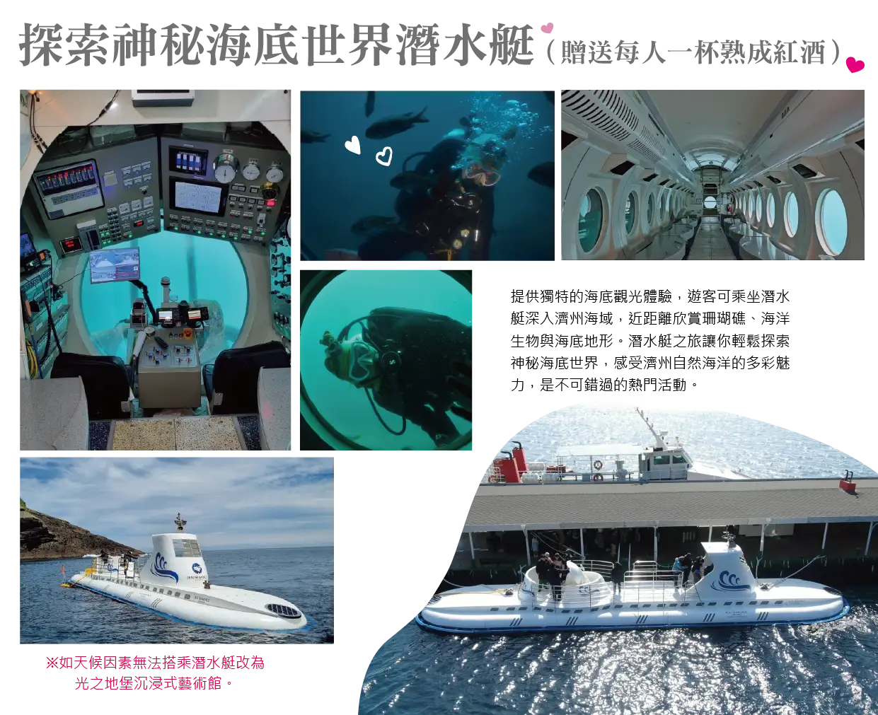 ※紅酒為贈送,如不享用則自行放棄;如天候因素無法搭乘潛水艇改為光之地堡沉浸式藝術館。