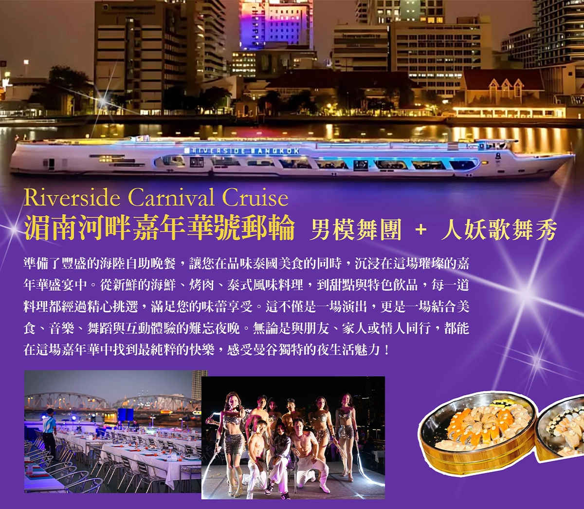 【Riverside Carnival Cruise湄南河畔嘉年華號郵輪】曼谷湄南河畔嘉年華 (Riverside Carnival)的活動,將帶您體驗一場充滿視覺與味覺享受的夢幻夜晚。這裡以壯麗的夜景聞名,閃爍的城市燈光倒映在河面上,營造出浪漫而迷人的氛圍。嘉年華活動融合了多種精彩娛樂,包括高水準的男模舞團表演、華麗的泰國人妖歌舞秀,以及震撼人心的 DJ 音樂和 Live 現場演出,為現場觀眾帶來最極致的視聽饗宴,湄南河畔嘉年華還準備了豐盛的海陸自助晚餐,讓您在品味泰國美食的同時,沉浸在這場璀璨的嘉年華盛宴中。從新鮮的海鮮、烤肉、泰式風味料理,到甜點與特色飲品,每一道料理都經過精心挑選,滿足您的味蕾享受。這不僅是一場演出,更是一場結合美食、音樂、舞蹈與互動體驗的難忘夜晚。無論是與朋友、家人或情人同行,都能在這場嘉年華中找到最純粹的快樂,感受曼谷獨特的夜生活魅力!