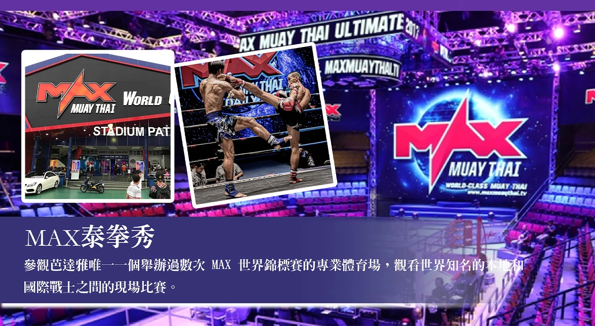 【MAX泰拳秀】泰拳(泰國跆拳道)以力量、速度、攻擊性著稱,是世界上最驚險刺激的武術之一。參觀芭達雅唯一一個舉辦過數次 MAX 世界錦標賽的專業體育場,觀看世界知名的本地和國際戰士之間的現場比賽。如果您在電視上發現泰拳令人興奮,想象一下在體育場體驗真實的泰拳,在那裡您可以感受到和聽到狂熱者的興奮和大氣的音樂。與人群一起歡呼,為你最喜歡的拳擊手歡呼,因為他們將在激烈的戰鬥中奪冠。所有的戰鬥都保證是真實的、真實的、令人興奮的!根據您的日程安排在工作日或週末比賽之間進行選擇,並參加一場讓您興奮不已的活動,這對於來泰國尋求刺激的人來說是必不可少的!