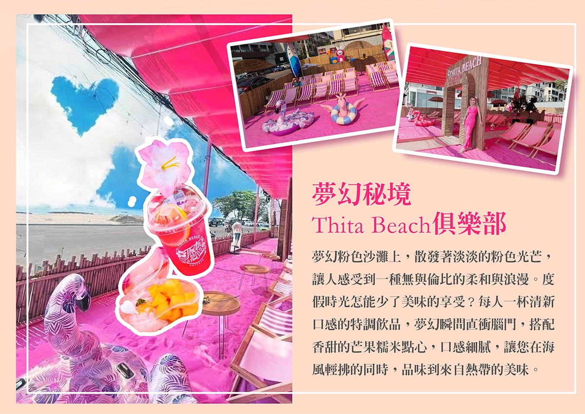 【夢幻秘境Thita Beach俱樂部】Thita Beach 夢幻粉色沙灘上,每一粒沙粒彷彿被陽光親吻過,散發著淡淡的粉色光芒,讓人感受到一種無與倫比的柔和與浪漫。不論是舉辦公司聚會,三五好友,還是親子共享歡樂時光,這裡都是一個完美的選擇。粉紅色的躺椅、碧藍的海水、無垠的天空,每一處景色都如同一幅美麗的畫作,而可愛的拍照道具更是讓每個角落都成為了拍照打卡的最佳背景。無論您是想拍下自己的夢幻瞬間,還是與親友或同事合影留念,這裡的每一刻都將成為您心中最美的回憶。
