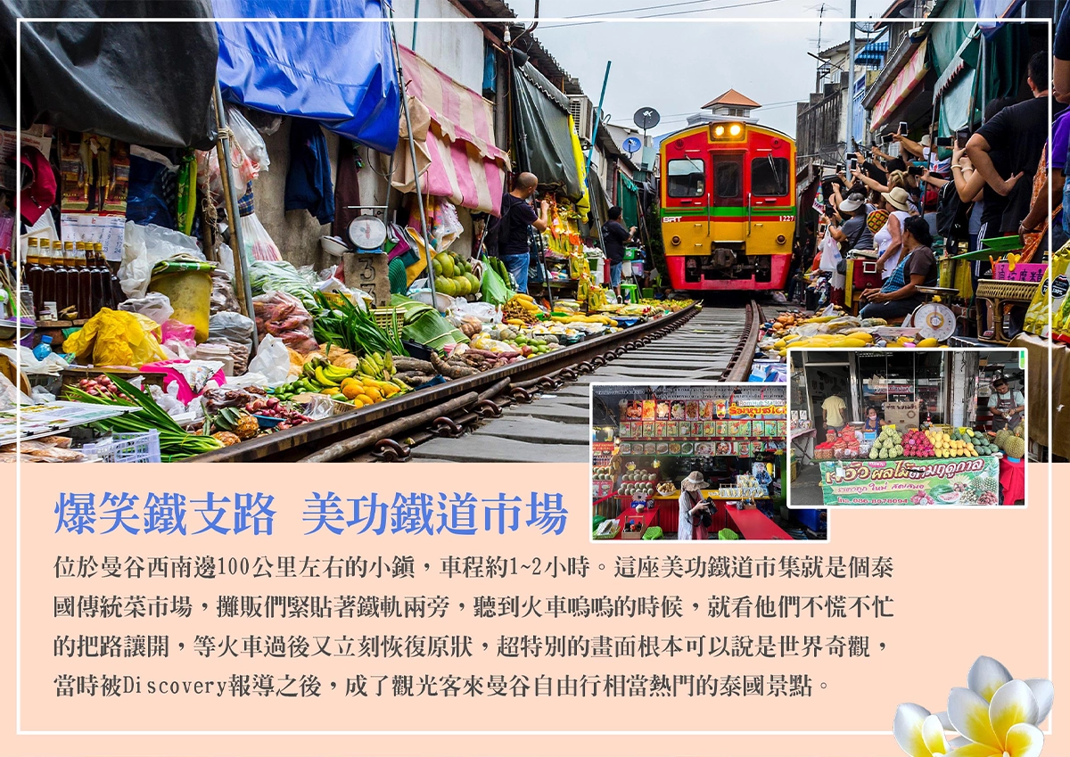 【爆笑鐵支路~美功鐵道市場】位於泰國美功 (Mae Klong, ตลาดแม กลอง) ,是位於曼谷西南邊100公里左右的小鎮,車程約1~2小時。這座美功鐵道市集就是個泰國傳統菜市場,攤販們緊貼著鐵軌兩旁,聽到火車嗚嗚的時候,就看他們不慌不忙的把路讓開,等火車過後又立刻恢復原狀,超特別的畫面根本可以說是世界奇觀,當時被Discovery報導之後,成了觀光客來曼谷自由行相當熱門的泰國景點。
