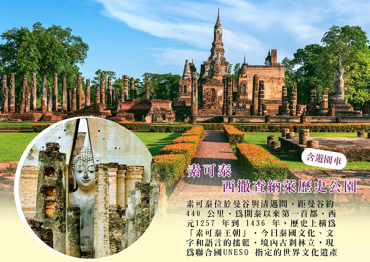 【世界歷史文化遺產~素可泰歷史遺跡公園(含遊園車)】素可泰位於曼谷與清邁間.距曼谷約440 公里.為開泰以來第一首都.西元1257 年到 1436 年,歷史上稱為「素可泰王朝」.今日泰國文化、文字和語言的搖籃.境內古剎林立,現為聯合國UNESO 指定的世界文化遺產.瑪哈泰寺皇家寺院現風華佔地約 3.2 平方公里的素可泰歷史遺跡公園,面積相當於 12.3個台北大安森林公園。1238 年,中南半島的真臘 ( 王國衰敗,泰族部落遂而在現今的遺跡公園,逐步建立素可泰王朝;Sukhothai 泰文意 思為「幸福的曙光」,而這「曙光」也為泰國帶來了近 200 年的輝煌盛世,文化也同步發展鼎盛,並自此創立泰文,其中最大的體現便是宗教信仰,1275 年至 1317 年引進小乘佛教後,王朝境內廣設寺院、佛塔,光是在素可泰歷史遺跡公園內,寺廟就達 20 多座。眾多廟宇中,西沙維寺 (Wat SriSawai),可瞧見 12 世紀高棉人所建的 3 座高棉式佛塔,塔身象徵著印度教的三大神祇,其後才改為佛教寺院。而建於人工湖上的沙西寺 (Wat Sa Si),雙跏趺坐的大佛,背倚著高聳的鐘型佛塔,也極具看頭。遺跡公園中最大的廟宇是皇家寺院的瑪哈泰寺 (Wat Mahathat),原有 300 座佛塔、 10 座僧院,如今雖然只留下幾座佛塔、支柱、地基,以及數尊雙跏趺坐的佛像、 2 尊結有不同手勢的立佛,但仍讓人由此瞧見昔日的素可泰王朝輝煌盛世。