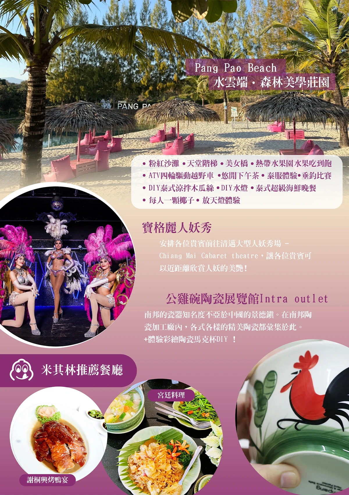 【Pang Pao Beach水雲端•森林美學莊園 (粉紅沙灘+天堂階梯+美女橋+熱帶水果園水果吃到飽+ATV四輪驅動越野車+悠閒下午茶+泰服體驗+垂釣比賽+D.I.Y泰式涼拌木瓜絲+D.I.Y水燈+泰式超級海鮮晚餐+每人一顆椰子+放天燈體驗)】2020年全新開幕的水雲端•森林美學莊園坐落在群山之間,佔地39萊(62400平方公尺),泰文名稱是” Pang Pao Beach山上的海”,綠意唯美的莊園圍繞著水池及沙灘、梯田,山間輕透的卷雲,白雲對映著綠水,水光瀲灩晴,雲去山如畫,世界與我,各在一端,所以又稱為水雲端。水雲端•森林美學莊園,步步為景,隨手一拍都是美照,除了最著名的唯美粉紅沙灘,美女橋,還有高五米的天堂階梯與山谷鞦韆,另一區有伊甸熱帶水果園及香草花園、百年茶園,散落在稻田中的格子網茅草小屋,亦備有餐廳和咖啡廳及手作小屋。