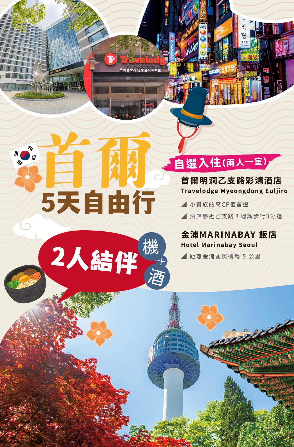 2‧【住宿】首爾地區四晚住宿酒店(兩人一室)(不含酒店早餐) ,若逢單人報名,需補足單人房差,依所選飯店補價差。