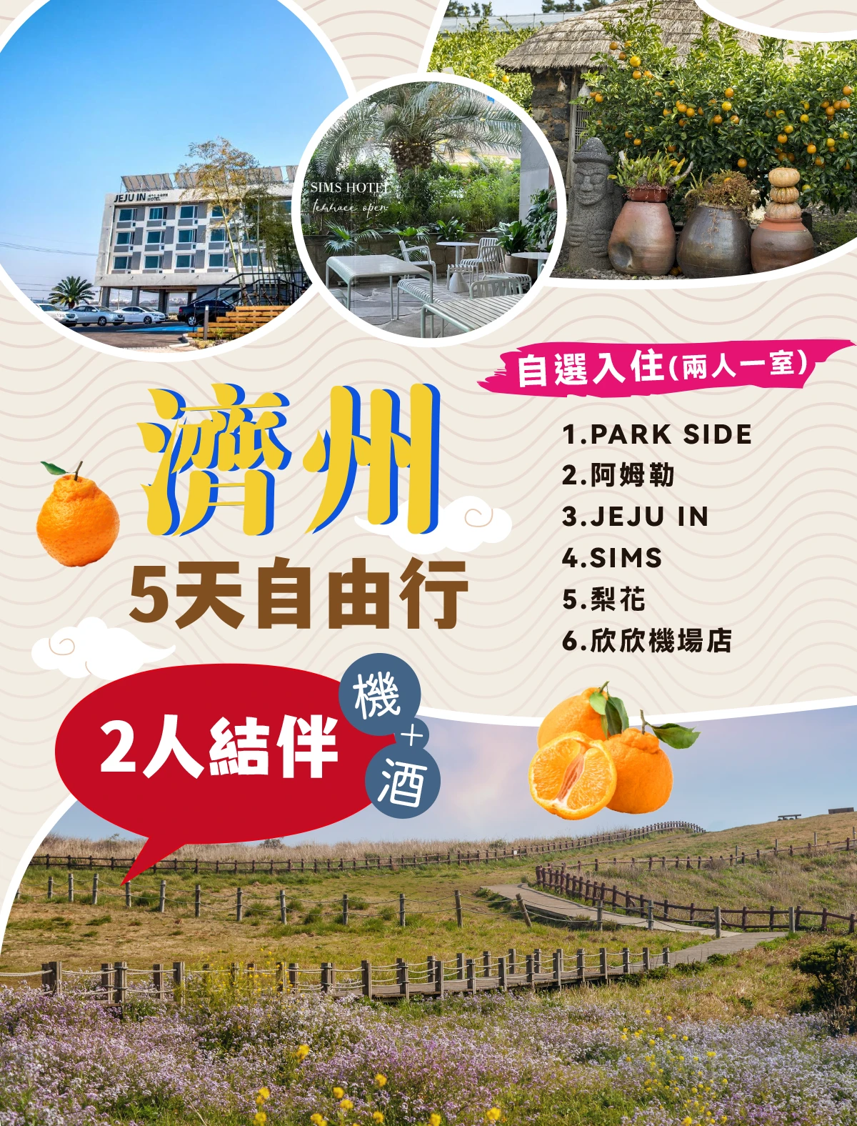 2‧【住宿】濟州地區四晚住宿酒店~PARK SIDE或阿姆勒或JEJU IN或SIMS或梨花或欣欣機場店(兩人一室)(不含酒店早餐) ,若逢單人報名,需補足單人房差,依所選飯店補價差。